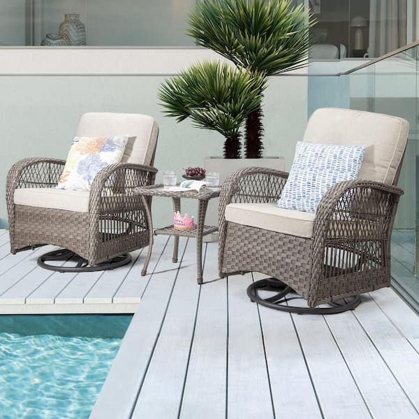 3-Piece Brown Frame Wicker Patio Outdoor Bistro Set, with Square Coffee Table, Beige Cushions, for Garden