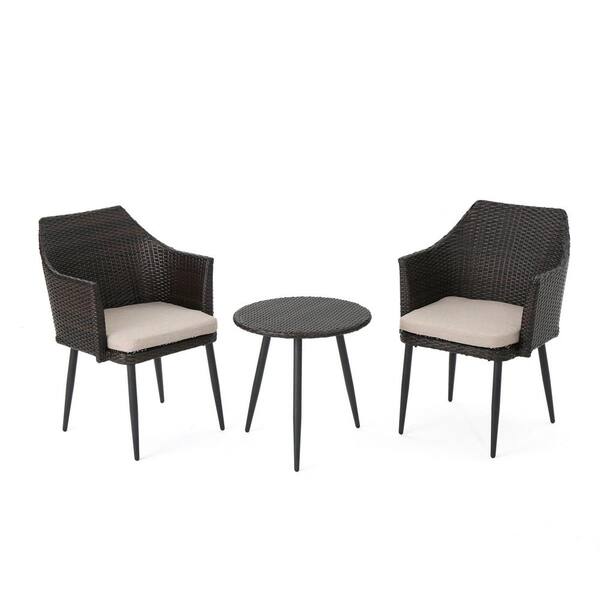 3-Piece Brown PE Rattan Wicker Round Table Outdoor Bistro Set with Beige Cushions