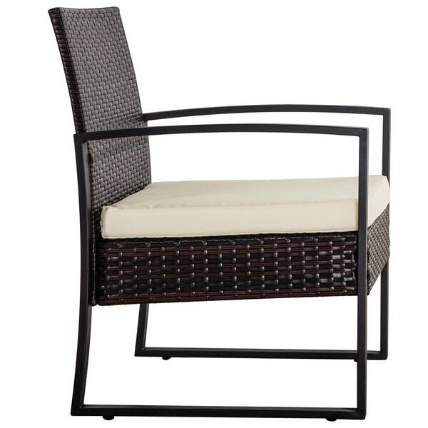 3-Piece Brown Rattan Wicker Patio Outdoor Bistro Set with Beige Cushions, 2-Chairs and 1-Tempered Glass Table