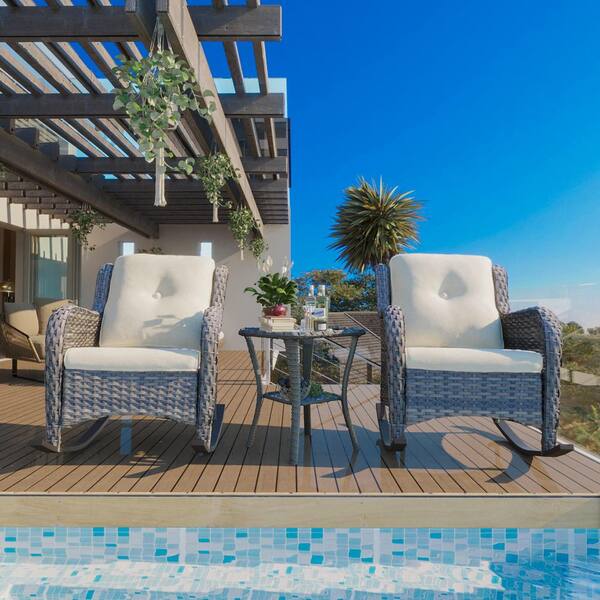 3-Piece Brown Wicker Patio Conversation Set, Rocking Chair Set and Coffee Table with Beige Cushions
