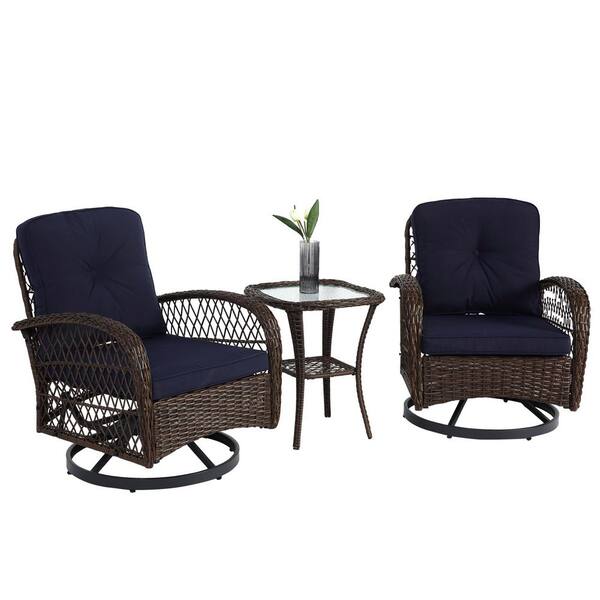 3-Piece Brown Wicker Patio Swivel Outdoor Rocking Chair with Navy Blue Cushions and Table