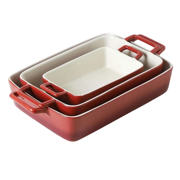 3-Piece Gradient Red Ceramic Rectangular Baking Dish Set Stoneware Scratch Resistant Oven Safe Cookware