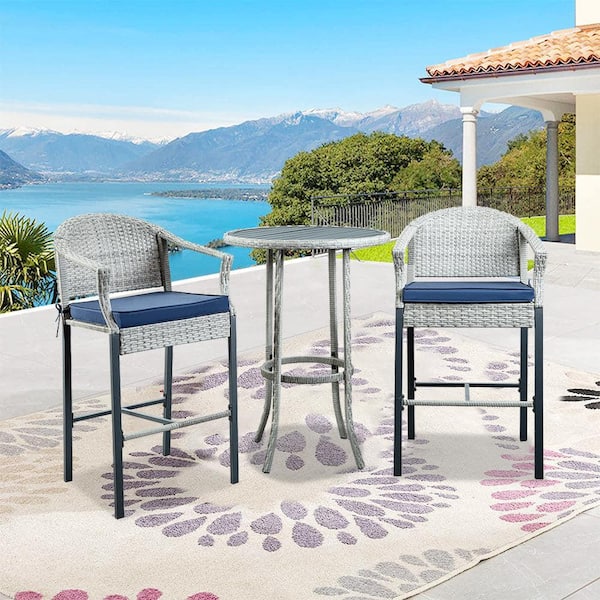 3 Piece Gray Frame Wicker Outdoor Bistro Set, with Blue Cushions and Round Top Coffee Table, for Garden Poolside