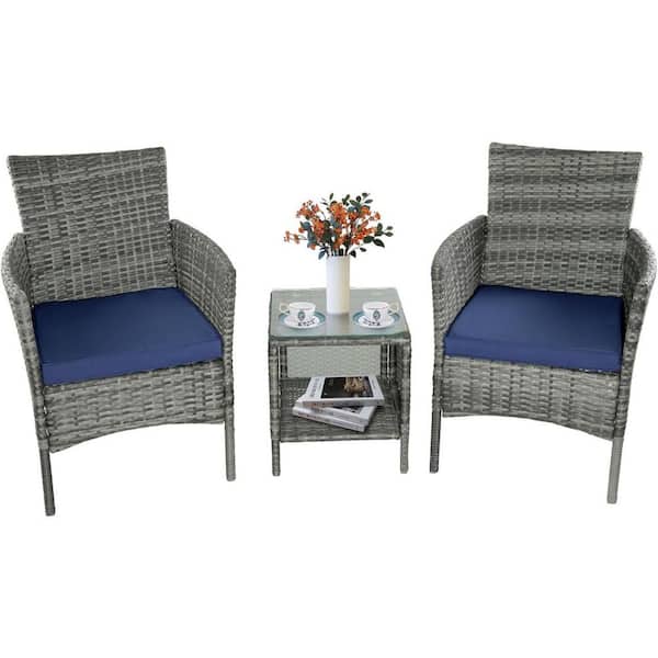 3-Piece Gray Wicker Outdoor Dining Set, Square Table and Rattan Chairs with Blue Cushions