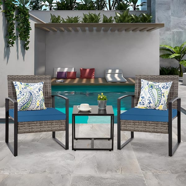 3-Piece Gray Wicker Patio Conversation Set with Coffee Table and Blue Cushions