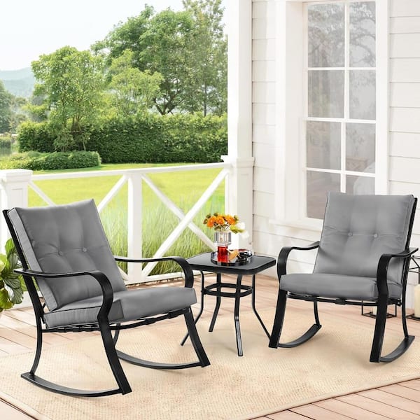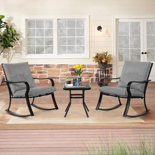 3-Piece Iron Outdoor Bistro Set with Gray Thickened Cushion and Glass-Top Coffee Table