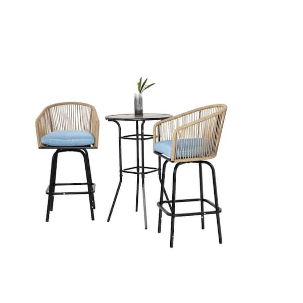 3-Piece Metal Outdoor Bistro Set with Round Bar Table and Swivel Bar Chairs and Blue Cushions for Patio, Garden