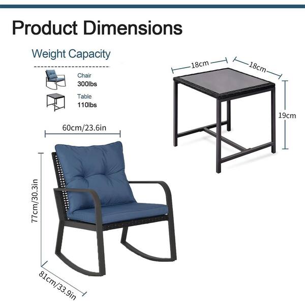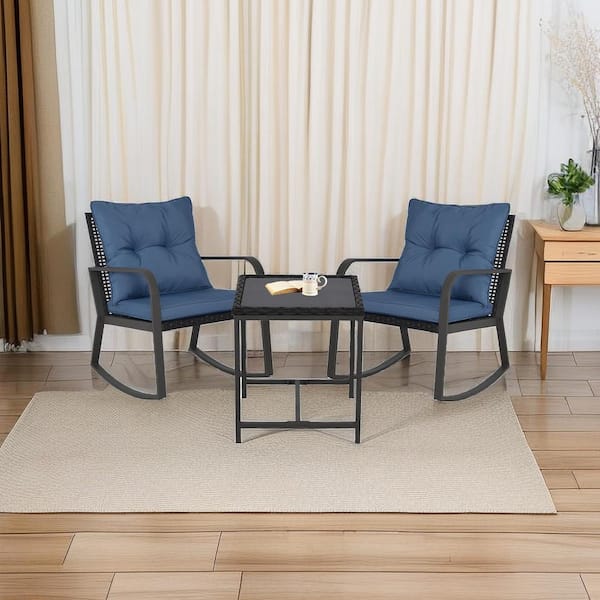 3-Piece Metal Outdoor Patio Conversation Sets Bistro Set with Wicker-Top Rocking Chairs Blue Cushions Glass-Top Table