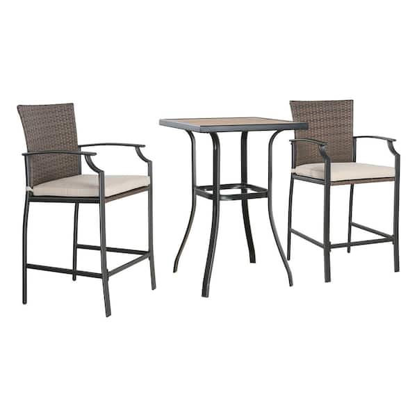 3-Piece Metal Outdoor Serving Bar Set with Cushion, 2 Wicker Bar Chairs and Wood-like Bar Table