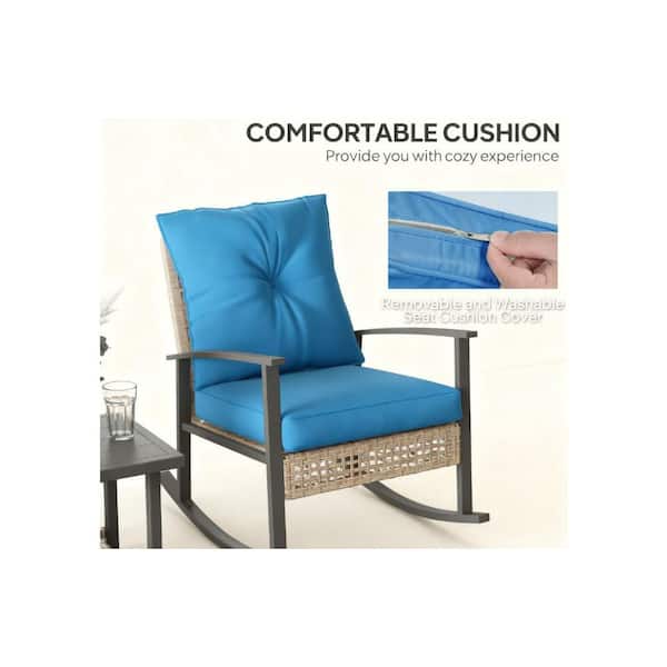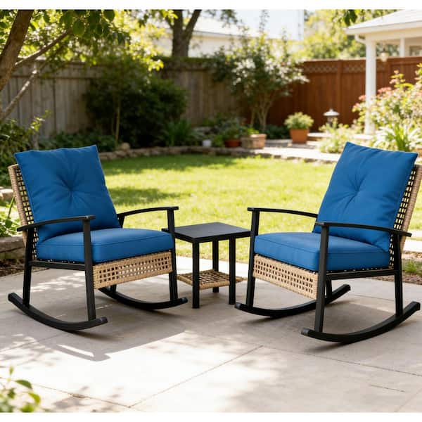 3-Piece Metal Patio Conversation Set with Blue Button Tufted Cushions, Rattan Rocking Chairs, Coffee Table