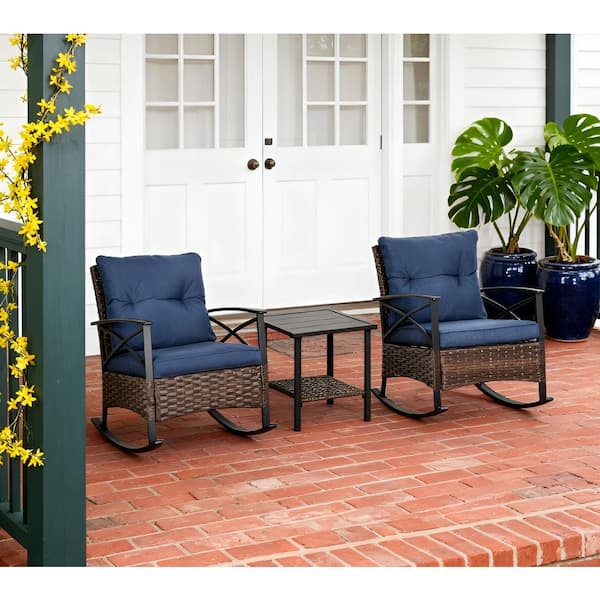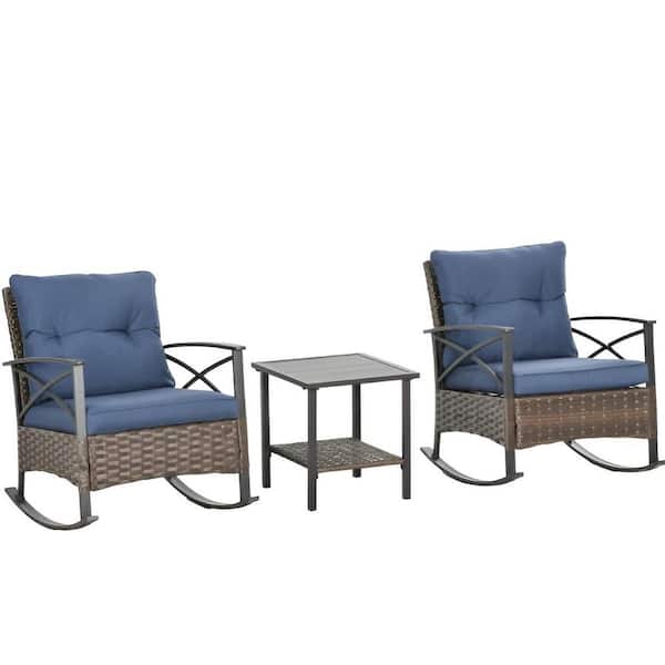 3-Piece Metal Patio Conversation Set with Dark Blue Button Tufted Cushions, Rattan Rocking Chairs, Coffee Table