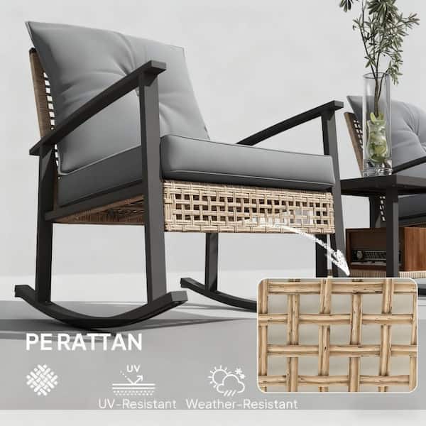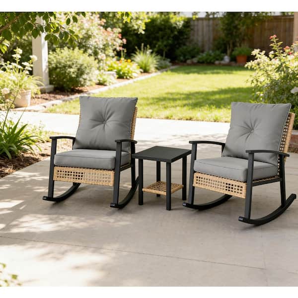 3-Piece Metal Patio Conversation Set with Gray Button Tufted Cushions, Rattan Rocking Chairs, Coffee Table