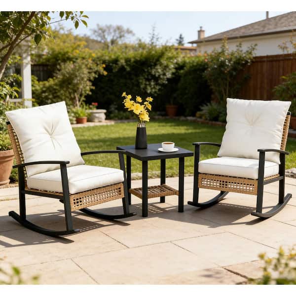 3-Piece Metal Patio Conversation Set with White Button Tufted Cushions, Rattan Rocking Chairs, Coffee Table