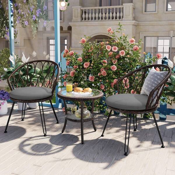 3-Piece Metal Rattan Patio Outdoor Bistro Set with Gray Cushions and Table