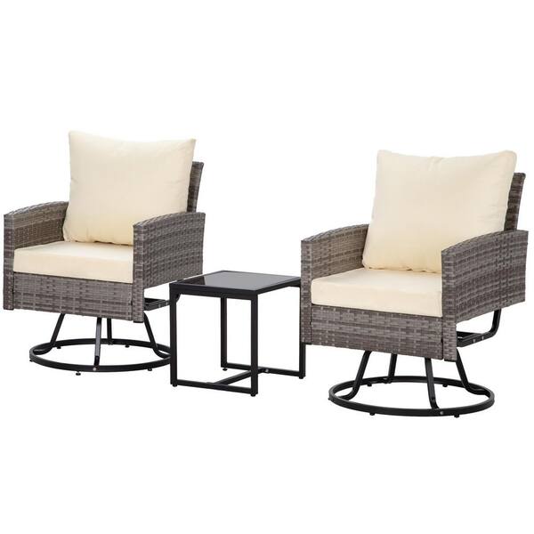 3-Piece Outdoor Conversation Set Handwoven Dark Gray Rattan Wicker Chairs with Beige Cushions, Tempered Glass Table