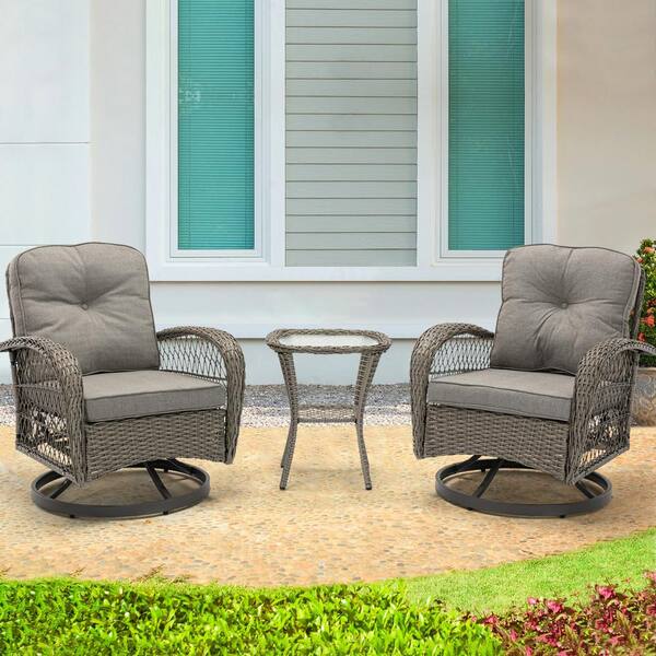 3-Piece Outdoor Wicker Modern Swivel Patio Conversation Set with Gray Cushions