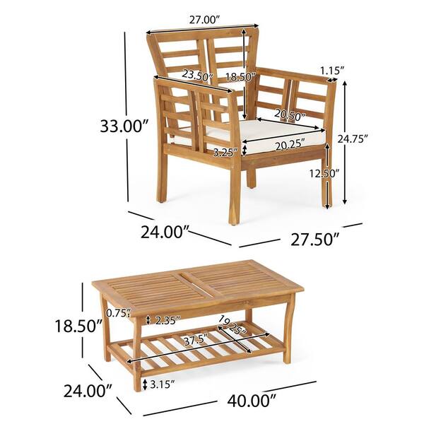 3-Piece Outdoor Wood Patio Conversation Set with Removable Cushion, Side Table for Yard, Porch, Poolside, Garden Brown