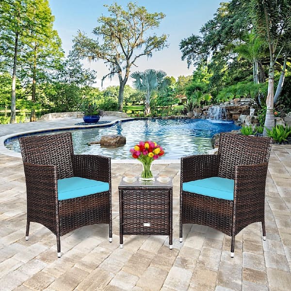 3-Piece PE Rattan Wicker Patio Conversation Set Outdoor Chairs and Coffee Table with Turquoise Cushion