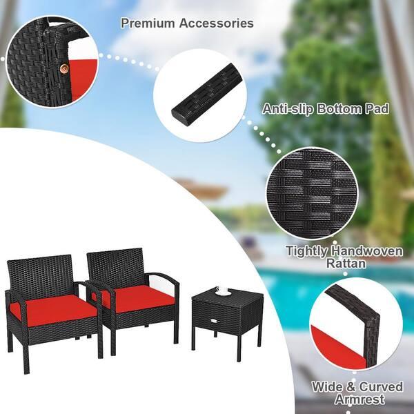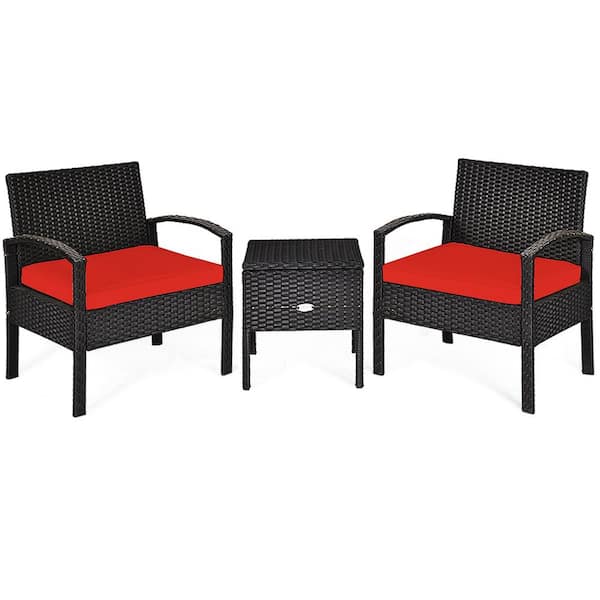 3-Piece PE Rattan Wicker Patio Conversation Set with Washable and Removable Cushion for Patio in Red