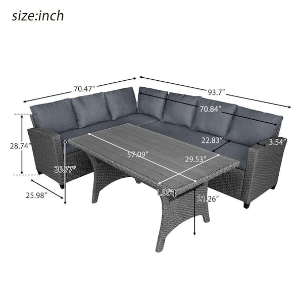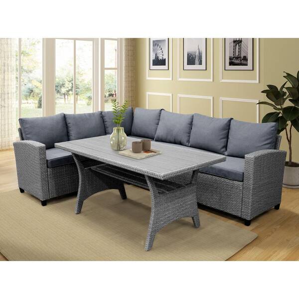 3-Piece PE Rattan Wicker Patio Outdoor Furniture Conversation Set All-Weather Sectional Sofa Set with Grey Soft Cushions