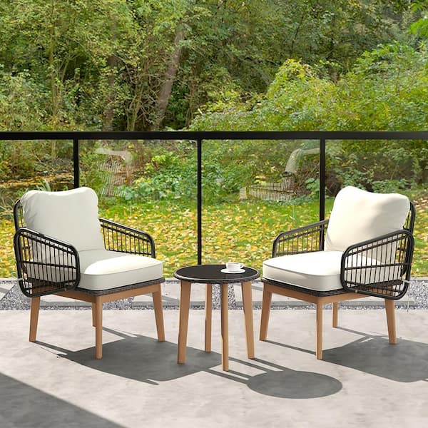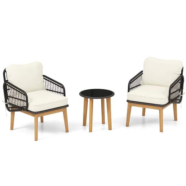 3-Piece Patio Chair Set Wicker Chair and Side Table Set with Soft Cushions and Tempered Glass Tabletop
