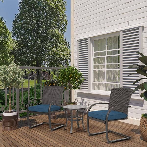3-Piece Rattan Metal C-Spring Outdoor Dining Chair Set with Peacock Blue Cushion