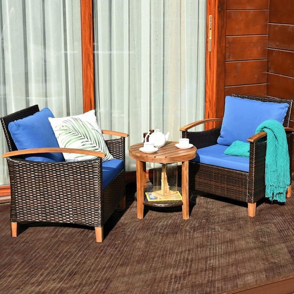 3-Piece Rattan Wood Patio Conversation Set With Blue Cushions and Round Wood Table