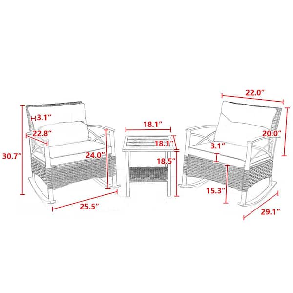 3-Piece Rocking Rattan Set Metal Patio Outdoor Rocking Chair Conversation Set with Blue Cushions