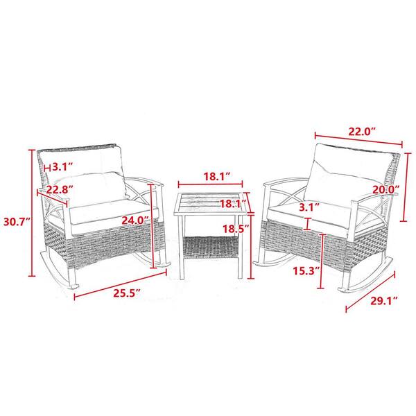 3-Piece Rocking Rattan Set Wicker Outdoor Rocking Chair with Blue Cushion
