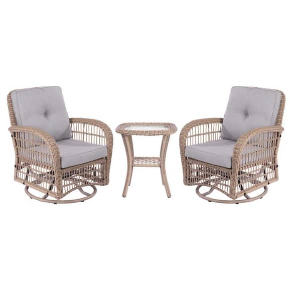 3-Piece Wicker Outdoor Bistro Rattan Patio Chairs Set 2 Rattan Rocker Chairs and Glass Coffee Table with Gray Cushion