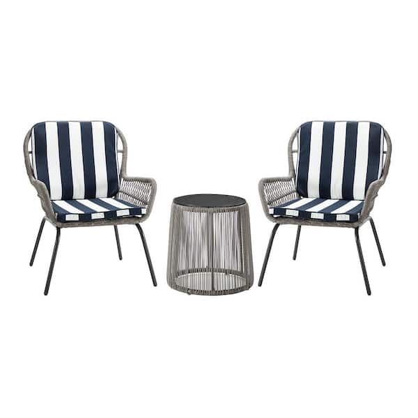 3-Piece Wicker Outdoor Bistro Set Outdoor Rattan Seating Group with Cushions in Navy Stripe