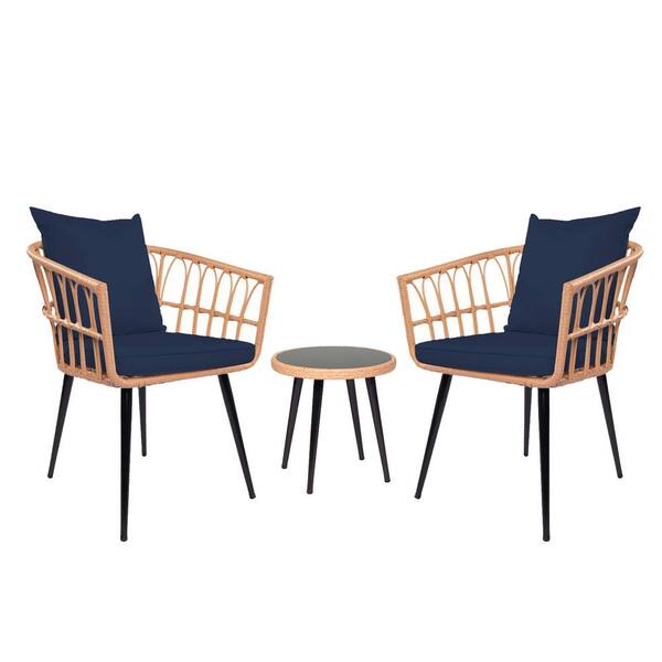 3-Piece Wicker Outdoor Bistro Set, Patio Rattan Conversation Set with Dark Blue Cushions for Backyard, Balcony, Poolside