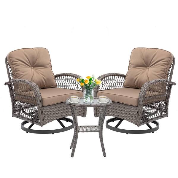 3-Piece Wicker Outdoor Bistro Set Patio Swivel Rocker Chairs with Khaki Cushions and Coffee Table