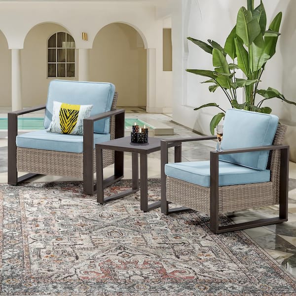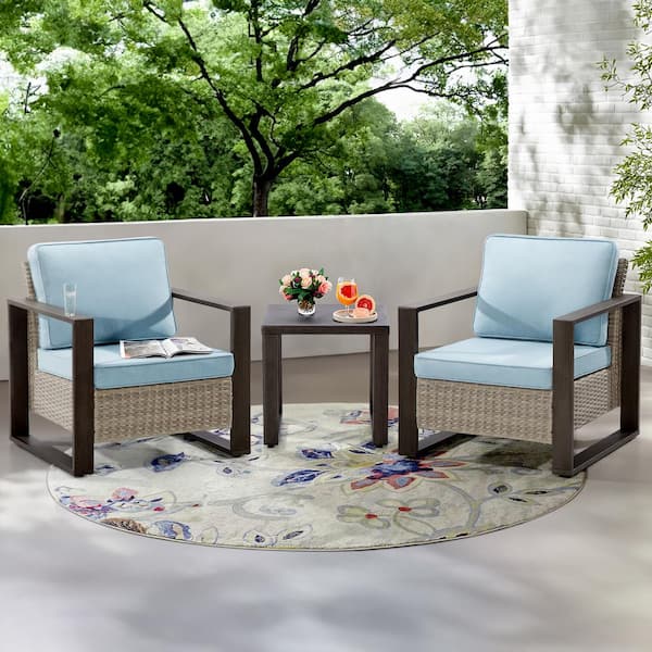 3-Piece Wicker Outdoor Lounge Chairs Patio Conversation Set with Metal Frame and Baby Blue Cushions