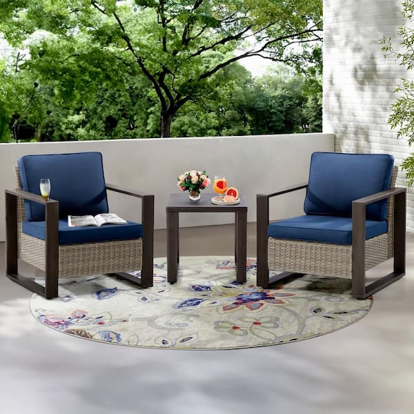 3-Piece Wicker Outdoor Lounge Chairs Patio Conversation Set with Metal Frame and Dark Blue Cushions