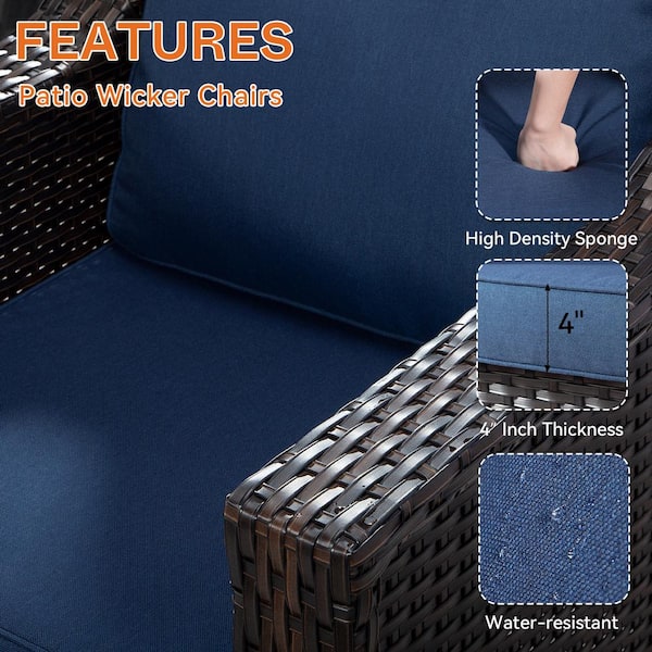 3-Piece Wicker Outdoor Patio Conversation Lounge Chair Set with Side Table and Blue Cushions
