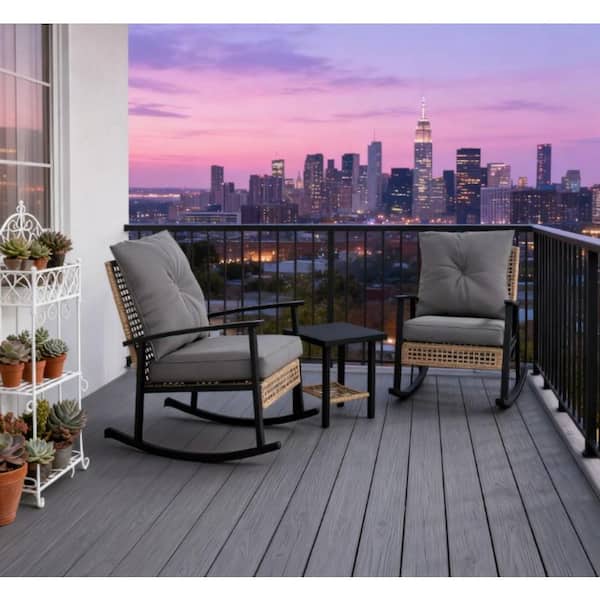 3-Piece Wicker Outdoor Patio Conversation Set Rocking Chair Set with Button Tufted Gray Cushions and Coffee Table