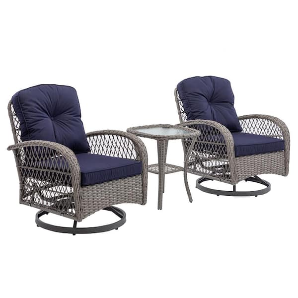 3-Piece Wicker Outdoor Patio Conversation Set Swivel Patio Chairs with Navy Blue Cushions and Coffee Table
