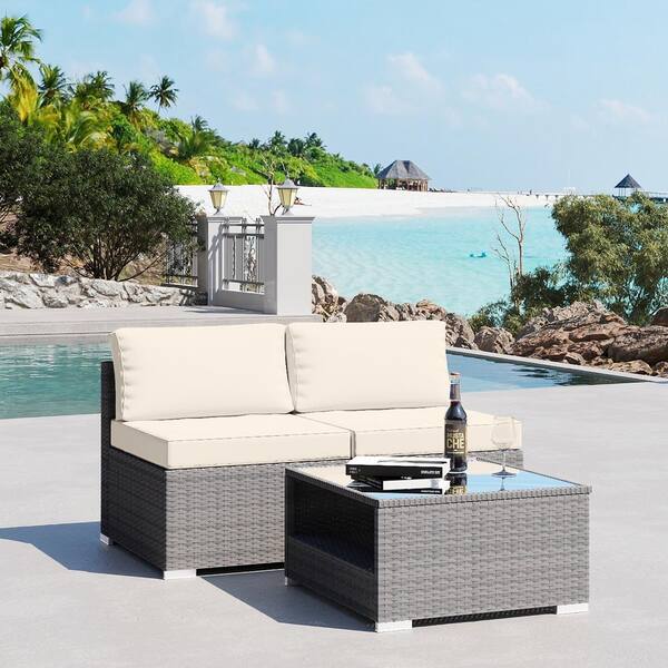 3-Piece Wicker Outdoor Patio Furniture Sectional Conversation Set with Beige Cushion and Side Table