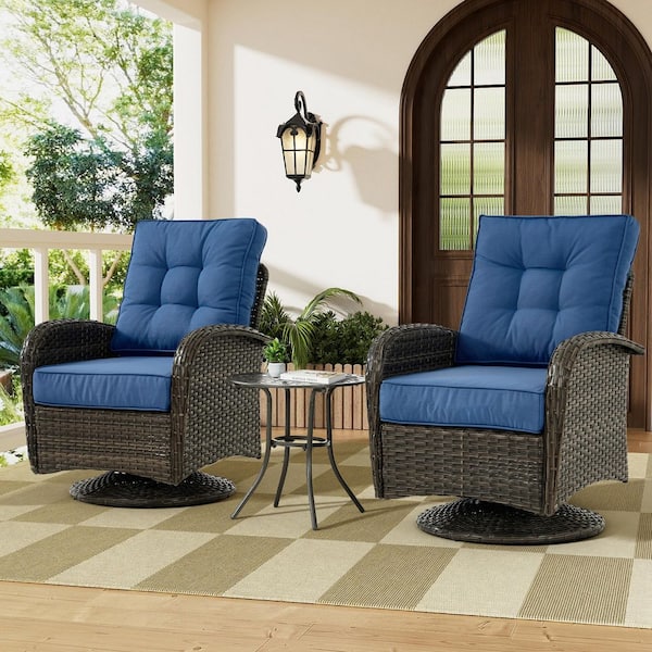 3-Piece Wicker Outdoor Rocking Chair Swivel Chair Patio Conversation Set with Blue Cushions and Table