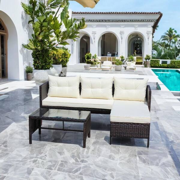 3-Piece Wicker Patio Conversation Set, Rattan Sectional Sofa with Beige Cushions with Glass Top Table