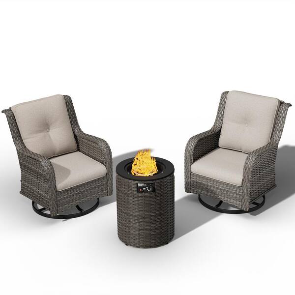 3-Piece Wicker Patio Conversation Set Swivel Rocking Chairs with Beige Cushions and Round Fire Pit Table