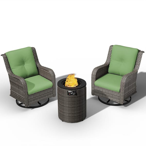 3-Piece Wicker Patio Conversation Set Swivel Rocking Chairs with Green Cushions and Round Fire Pit Table