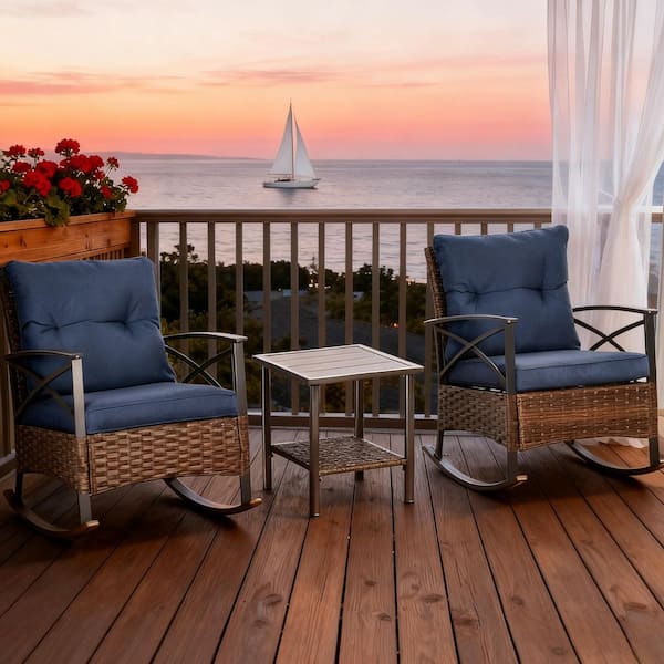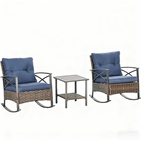 3-Piece Wicker Patio Conversation Set with Button Tufted Dark Blue Cushions, Rattan Rocking Chairs, Coffee Table