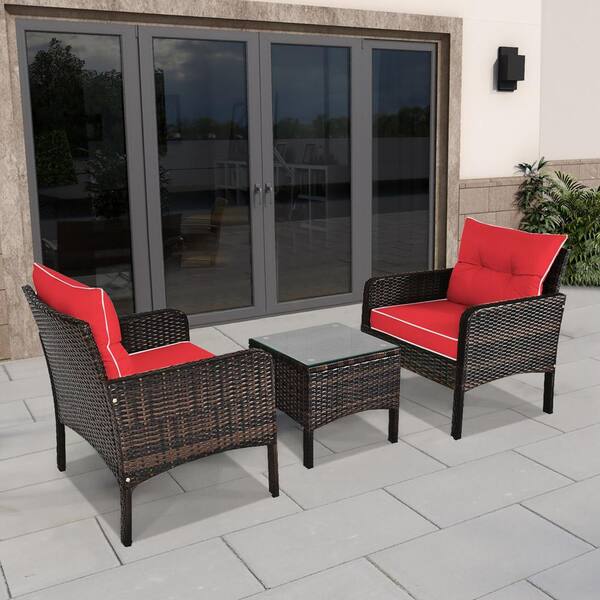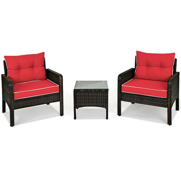 3-Piece Wicker Patio Conversation Set with Red Cushions