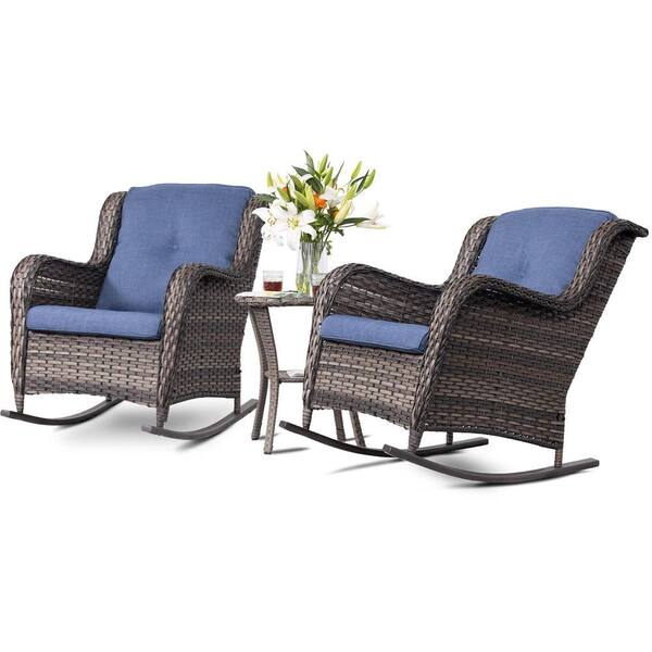 3-Piece Wicker Patio Outdoor Rocking Chair Set with Blue Cushions