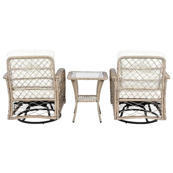 3-Piece Wicker Rattan Patio Conversation Set, Bistro Set with White Cushions, 2 Swivel Chairs and Square Table