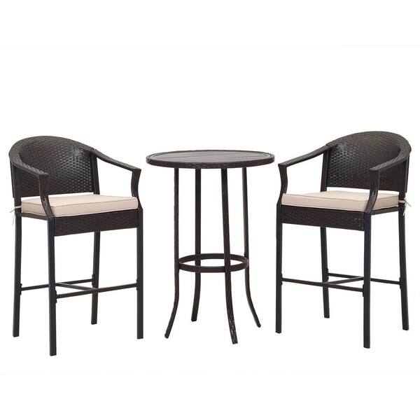 3-Piece Wicker Round Table Outdoor Bistro Set with Beige Cushions