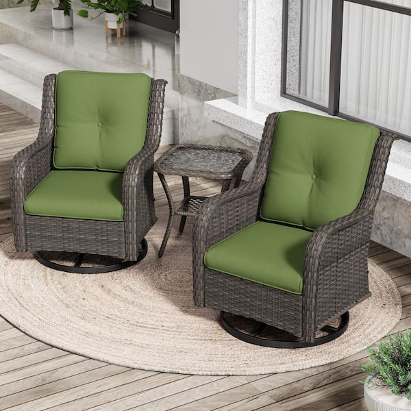3-Piece Wicker Swivel Outdoor Rocking Chairs Patio Conversation Set with Green Cushions