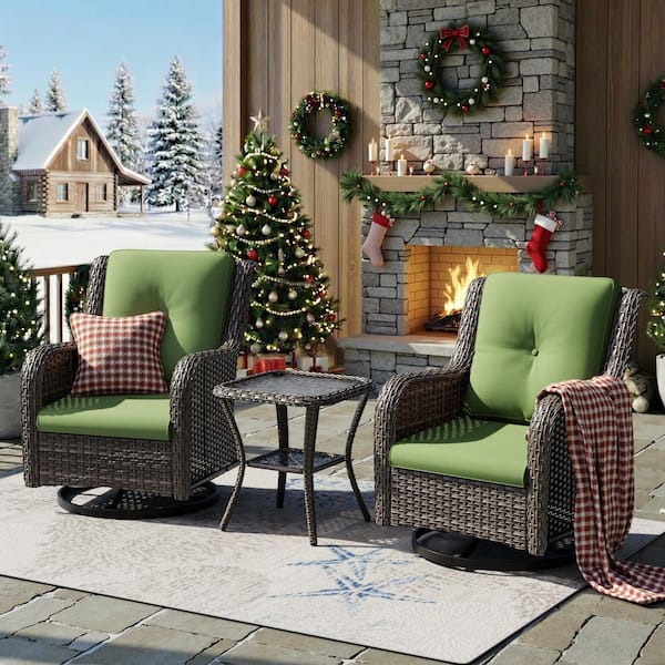3-Piece Wicker Swivel Outdoor Rocking Chairs Patio Conversation Set with Green Cushions